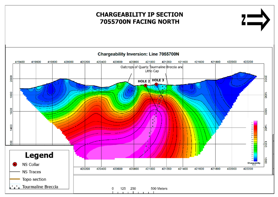 Figure 3: Section View IP 7055700N Chargeability Inversion. Projected proposed drill holes 2 and 3.