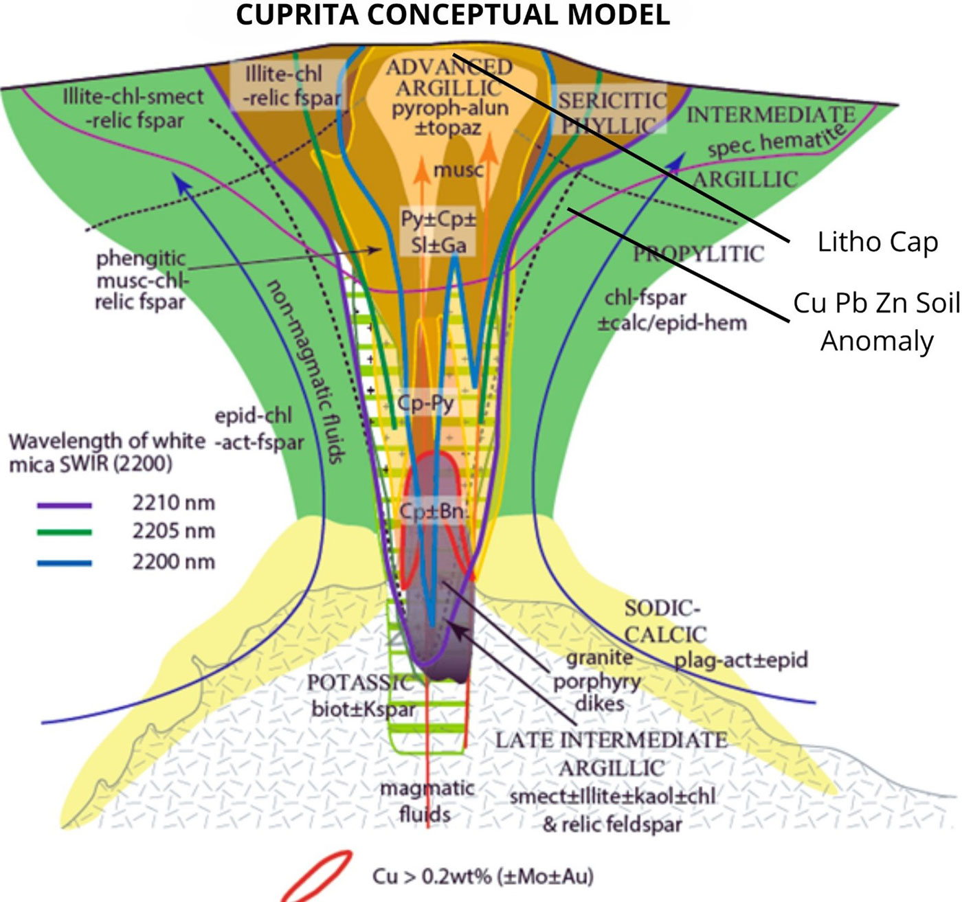 Figure 4. Conceptual model for the Cuprita porphyry target (modified after Halley et al., 2015 ). The key geological components for the classic mineralized Andean porphyry model have been identified at the Cuprita target.